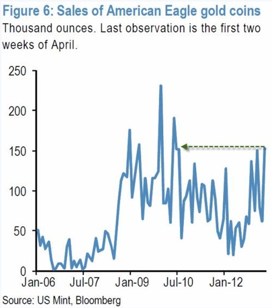 美国鹰牌金币的销售可能是黄金投资需求的一个具体指标,这种金币销售在过去两周内出现了暴涨。