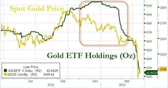 黄金ETF持有实物黄金的顶峰是在2012年12月,自此之后一直保持着相当稳定的抛售。相反,黄金价格的顶峰出现在2012年10月,自此之后稳步下跌。