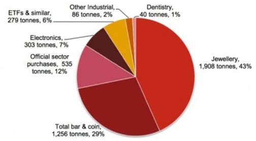 让我们看一看报告中的下面这幅2012年全球黄金需求图表。