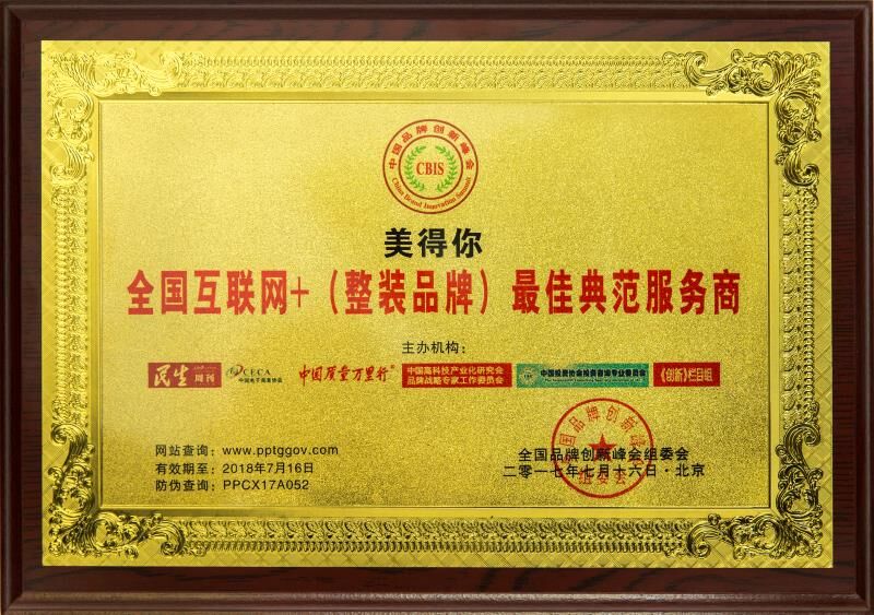 “整装”、“服务”、“最佳”——在全国品牌创新峰会组委会2017年颁发的这个奖项中,这几个关键字高度概括了美得你品牌的立身之本,整装的优惠价格,最佳的服务体验,一个品牌的成功,绝非偶然。