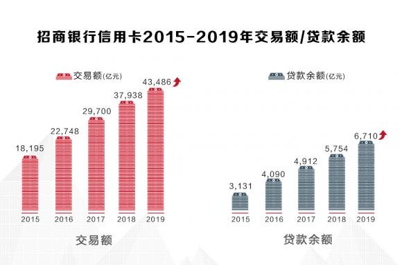 2019年,招行信用卡交易额达43486.15亿元,同比增长了14.62%;贷款余额6709.92亿元,较上年末增长16.62%。
